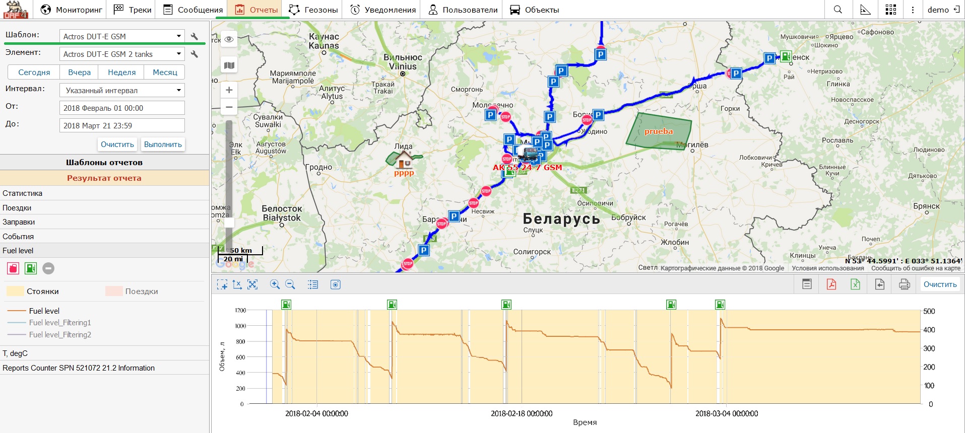 Отчеты содержат детализированную информацию, необходимую для эффективного контроля работы водителей и машин: продолжительность работы, время и место стоянок, расход топлива, заправки и сливы топлива, маршрут движения, скорость и др.