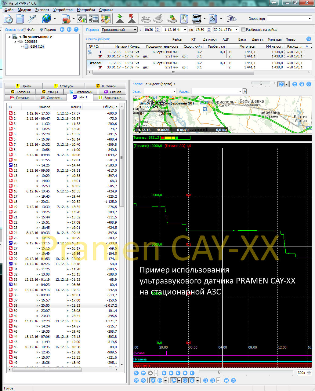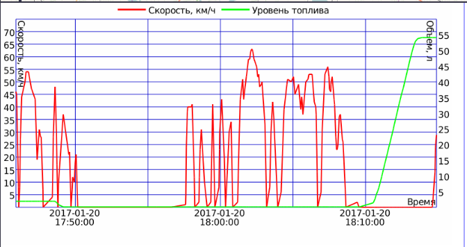 Пожалуйста, график во вложении. На графике видно, как пропан-бутан ушел в ноль, а дальнейшее передвижение автомобиля продолжилось на бензине до АГЗС. Ну и заправка в 55 литров. Заказчик не ставил цель учета бензина, его интересует только пропан.