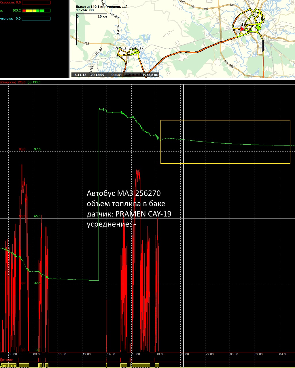 На графике есть характерные участки (При уровне больше половины после остановок машины(выделил желтым прямоугольником)), такие мы встречали только на автобусах МАЗ, а на газу и бензине ни разу. Вот и интересно с чего в друг.