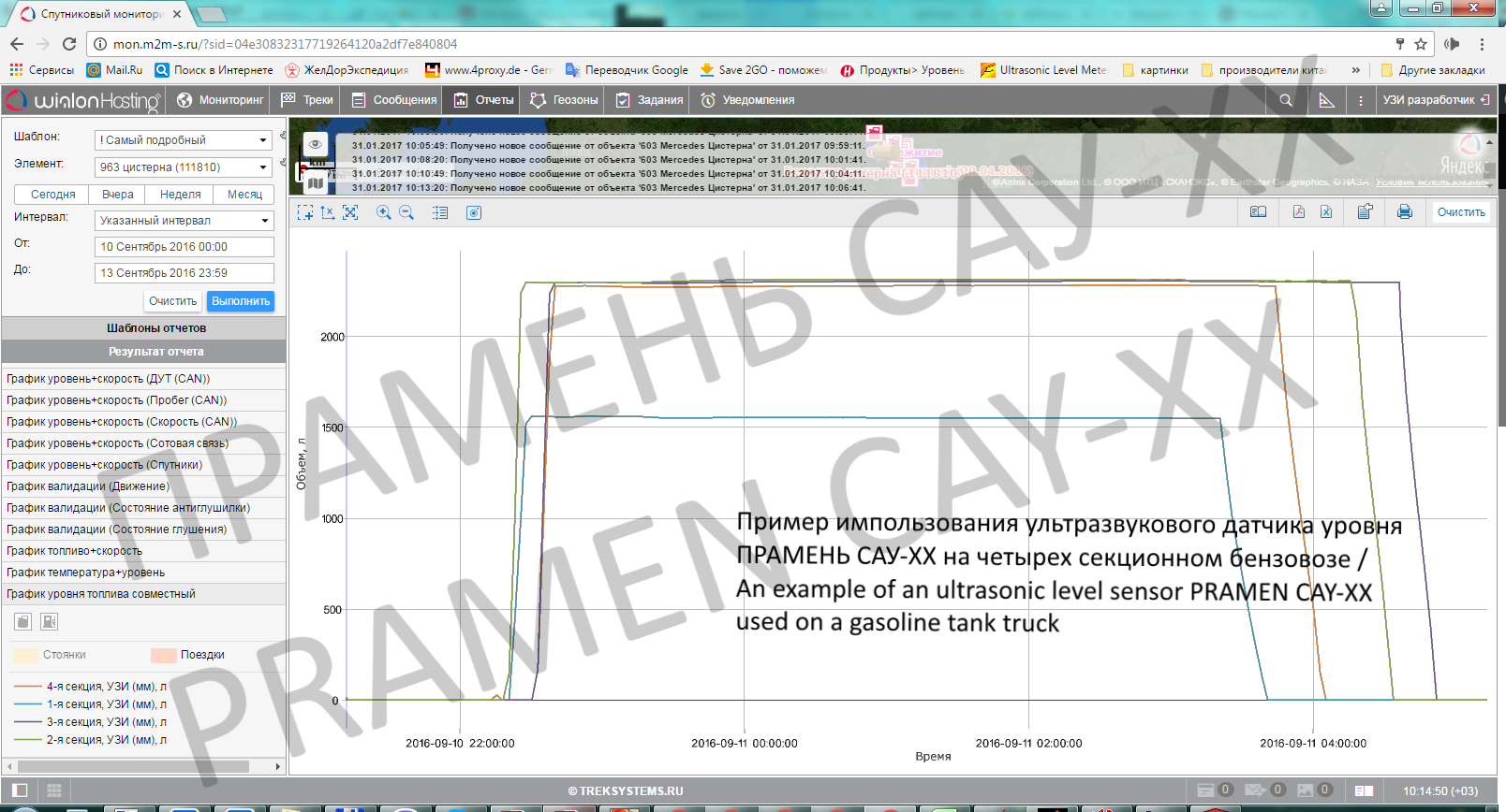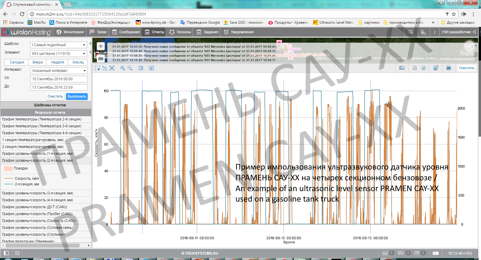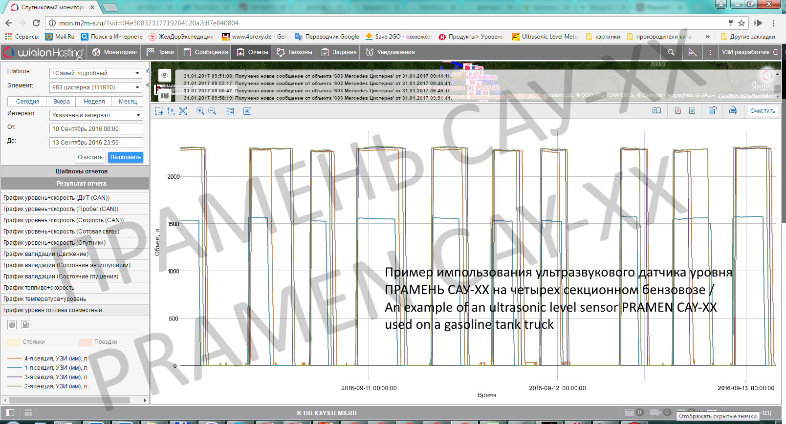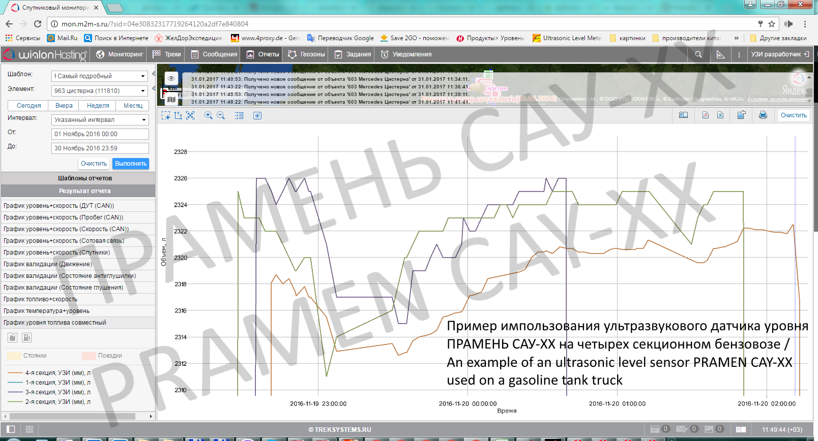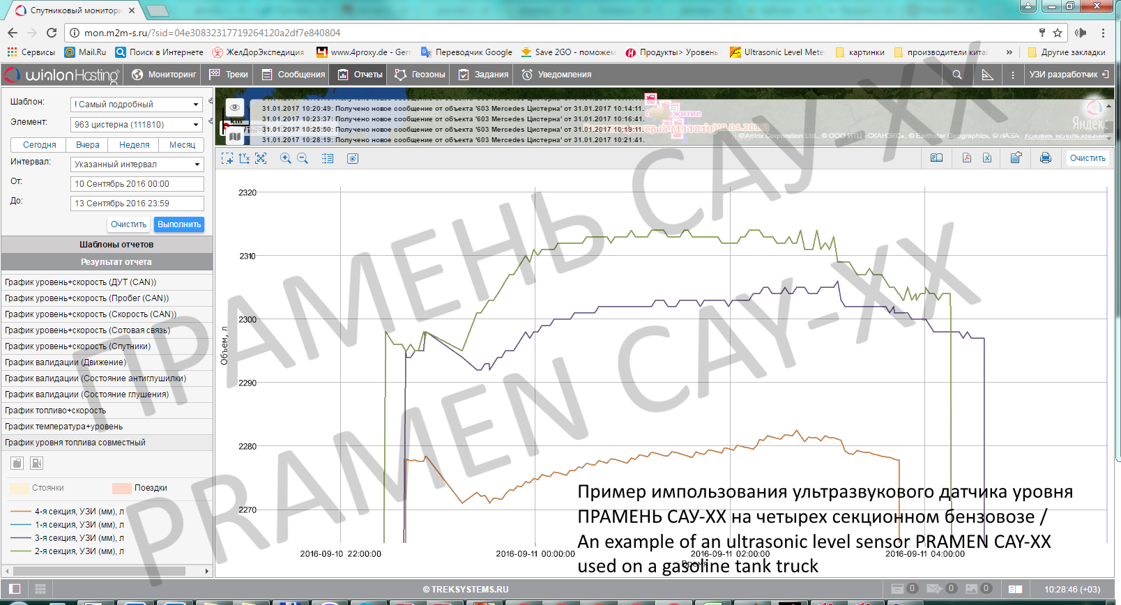 В моих примерах бензовоз загружался-ездил-разгружался и "жутких" колебаний нет, а ошибка по УЗ датчику в пределах 5 литров на 2300 литров.