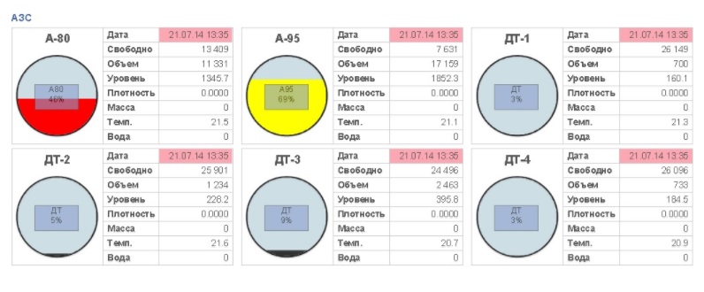 Предлагаю для контроля топлива на АЗС использовать приложение Sensonator. Для наглядности и информативности резервуары с топливом было бы неплохо изобразить в виде боковых срезов с остатком топлива в процентах. По каждой емкости сбоку ряд параметров: дата, свободно, объем, уровень, плотность, масса, температура, литраж, и т.д. Такая реализация будет очень полезна для учета топлива.