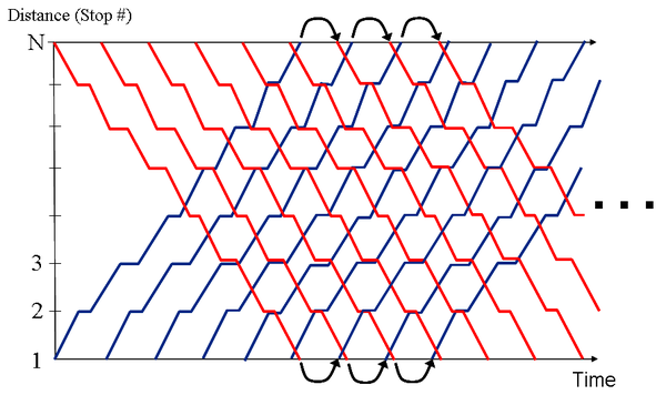 One way of visualizing such a system uses a so-called “string diagram,” shown in the attached figure. The blue lines indicate the trajectory of a vehicle from the terminal at stop 1 to the terminal at stop n, with short dwell times at each stop. Vehicles arriving at stop n then can return along the route in the opposite direction (the red lines), after a layover (indicated by the black arrows). These diagrams can be useful in visualizing vehicle movements and crosses along the route.