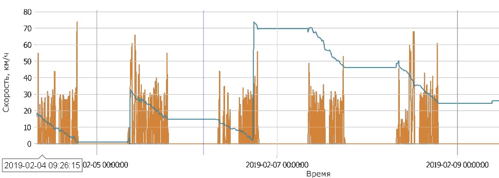 Теперь перейдём к расходу в моточасах, в движении и на холостом ходу. Как ни странно, колебания показаний ДУТ здесь тоже влияют на подсчёт. С вашего позволения, прикреплю обезличенный снимок графика уровня топлива в моточасах. На графике виден фон моточасов, сглаженный уровень топлива и скорость.