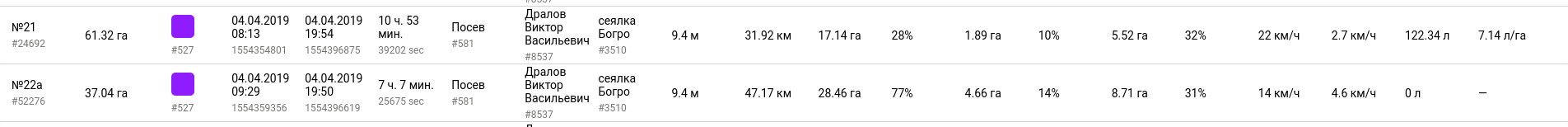 Так же встречаются ситуации где расход в виалоне есть и довольно большой с тем же интервалом работ, что и в хектерре, но в самой хектерре расхода почему-то нет совсем никакого. Учитывая, что пробег тоже сильно отличается, видимо расход берется кусками, а не за весь интервал и с большими колебаниями топлива при работе на поле за эти интервалы может ничего не быть.