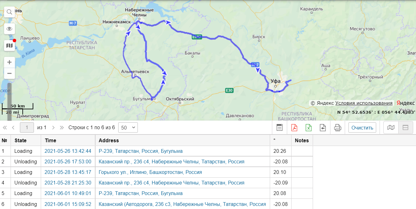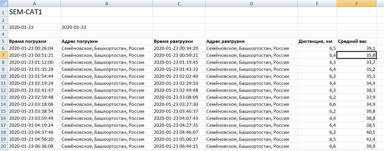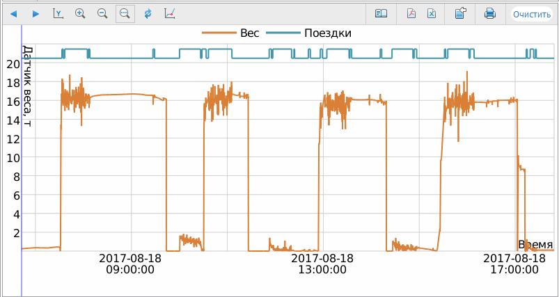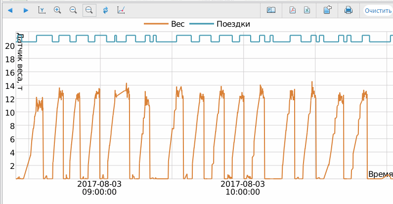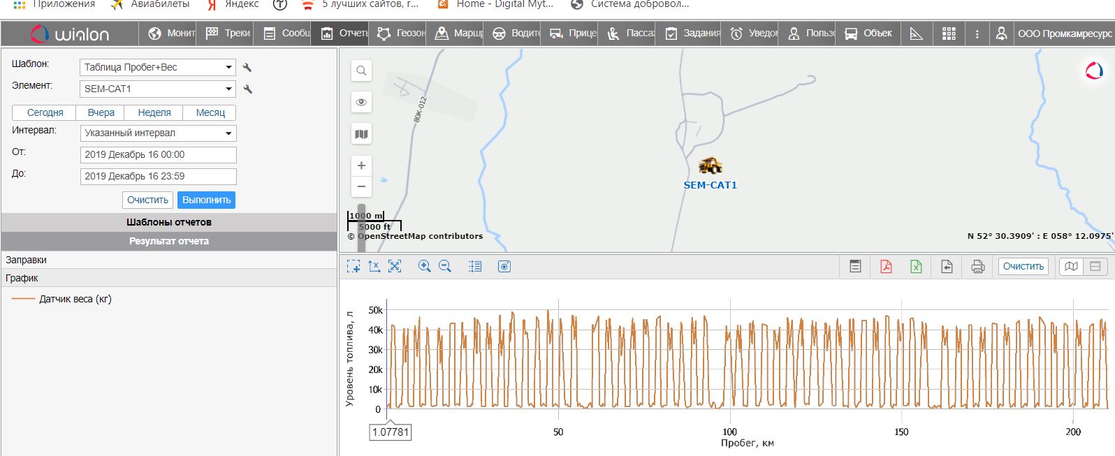 Мониторинг настроили через Wialon. Настроили отчет по ходкам и перевезенным тоннам.