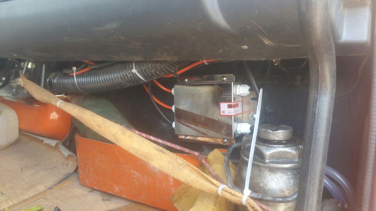 В первый день разобрались с задней подвеской, поставили датчики в гидроцилиндры. А к передним штуцера не подошли. Пришлось остаться на второй день. За ночь токарь изготовил переходники. Второй день был солнечным. Воткнули датчики, зарядили стойки азотом, протянули провода, подключили контроллер, дисплей в кабине и дублирующее табло для экскаваторщика.