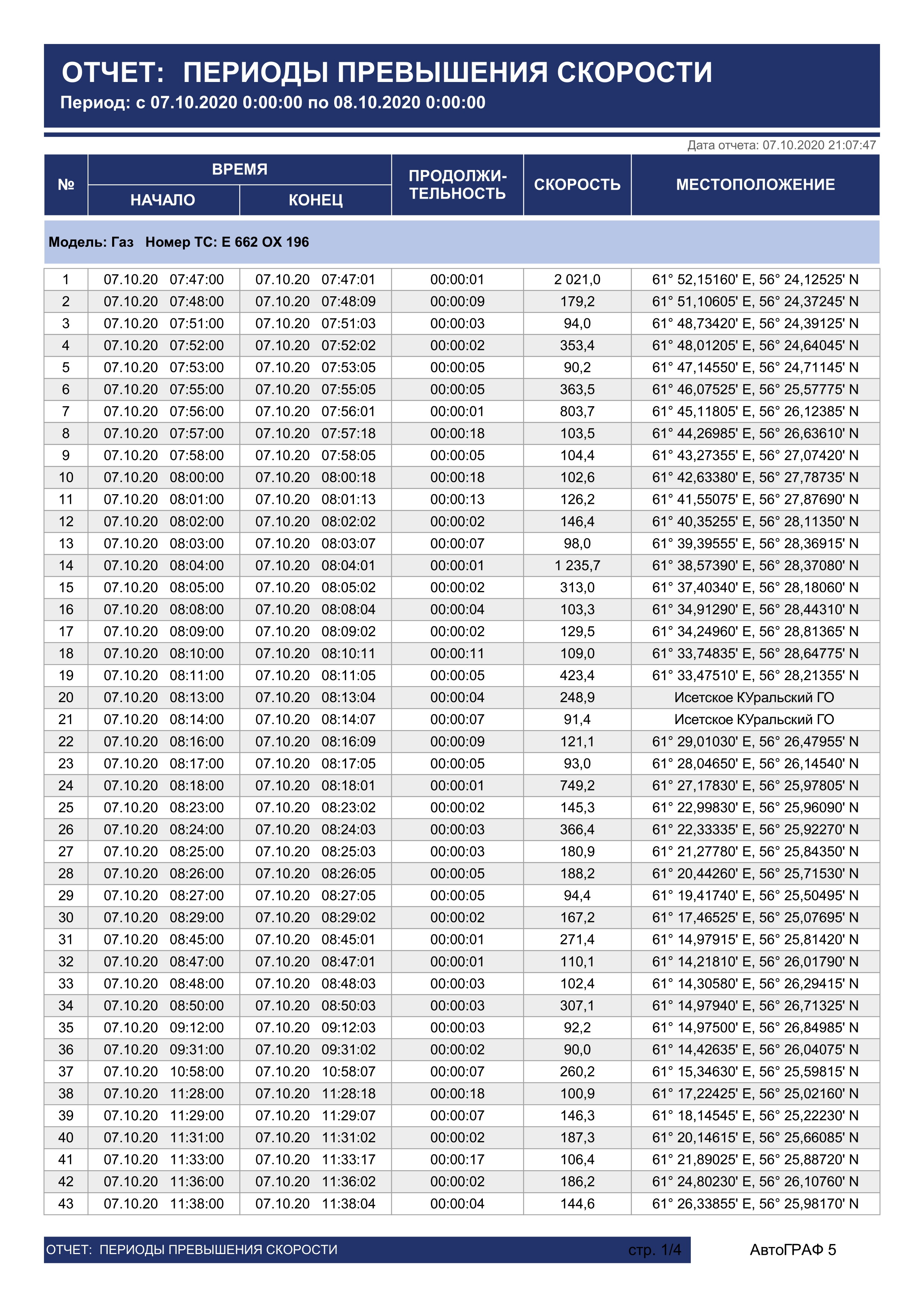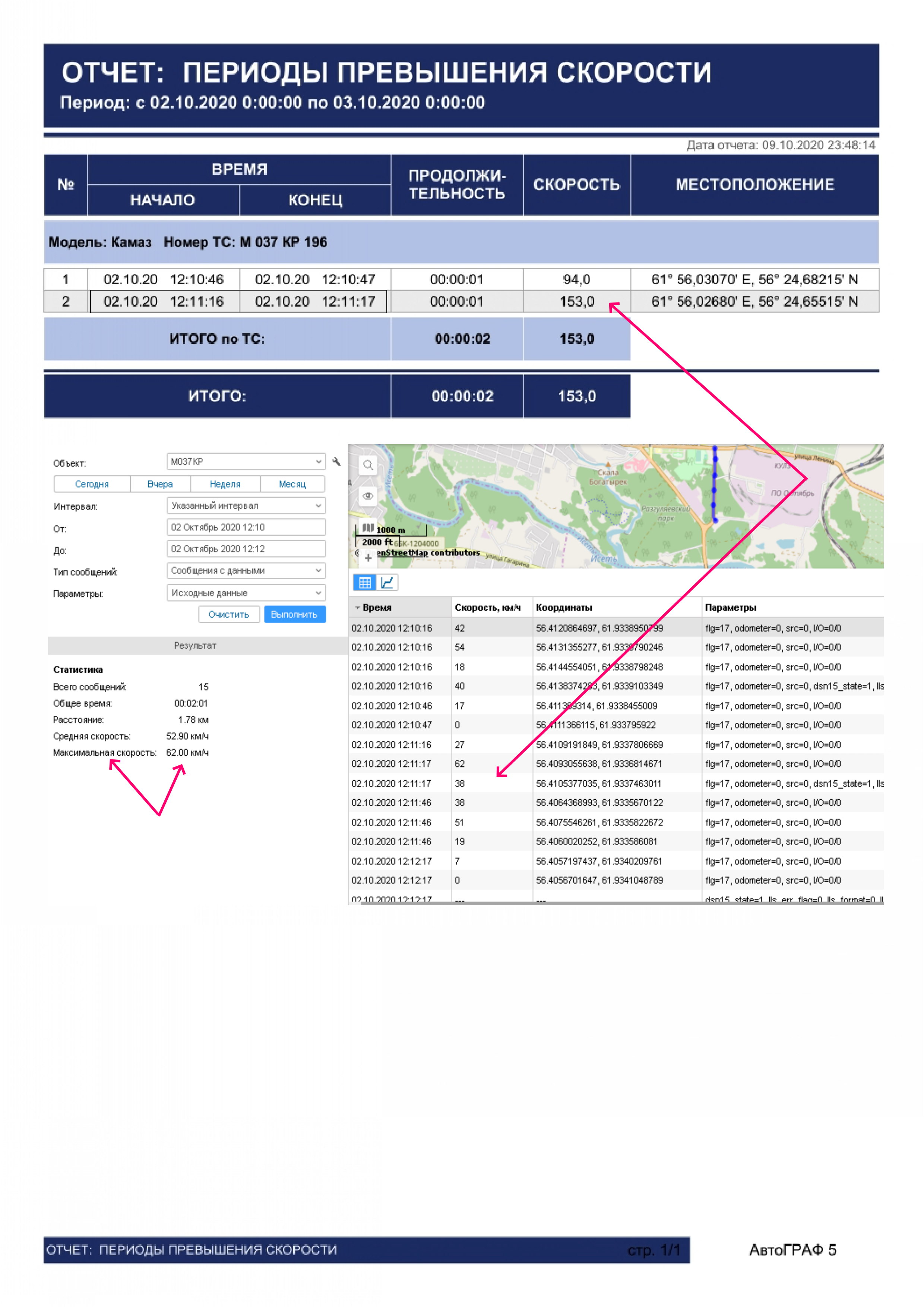 3. Что касается "оказалось, что система АФТОГРАФ вообще неправильно считает  как превышения так и скорость", рекомендуем Вам разобраться с качеством ретранслируемых данных. Пару раз мы уже указывали на кое-какие ошибки в ретрансляции. То, что наша система внезапно ровно на 1 минуту или на 2,5 минуты (!!!) сместила время - так вот я Вам сообщаю: АвтоГРАФ™ не корректирует время начала и конца отрезков трека, такого функционала в нем просто нет и не было.