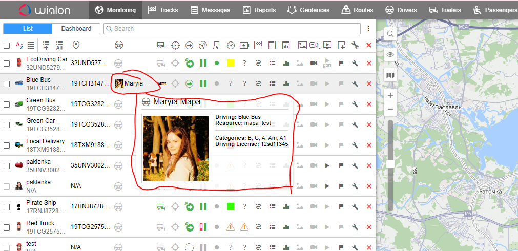 Or you could display linked drivers as a detailed information in the monitoring details or in the unit's tooltip. The proper option should be enabled in the Unit's Settings: "Show Additional Information about the Unit" part - "Driver's activity" option should be added to the monitoring's details and\or to the unit's tooltip.