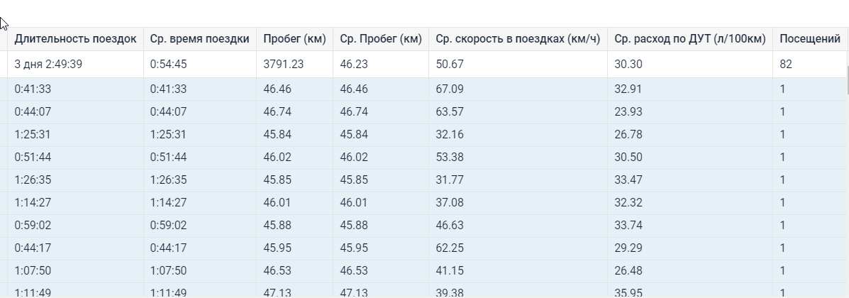 Детальная информация по поездкам, пробегу и расходу топлива в них, стоянкам и моточасам.