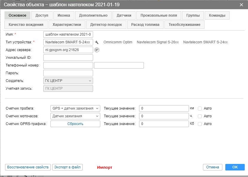 При настройке ТС в окне свойства объекта присутствуют кнопки "восстановление свойств"  и "Экспорт в файл".