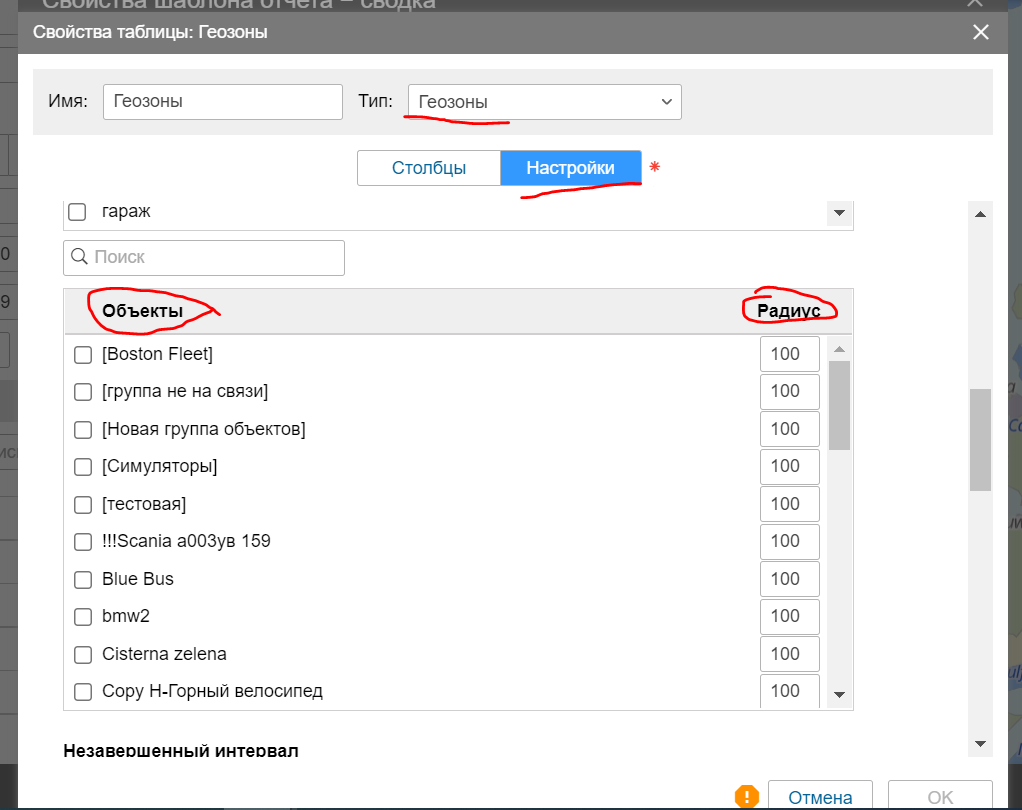 Вместо геозон в шаблоне отчета "Геозоны" могут быть выбраны объекты. Для них дополнительно указывается радиус. В таком случае эти объекты интерпретируются как подвижные геозоны, а действия объекта, по которому строится отчет, анализируются по отношению к этим движущимся геозонам. По отношению к этим объектам нужно иметь доступ Запрос сообщений и отчетов. Подробности тут https://docs.s-watcher.com/ru/hosting/user … /geofences