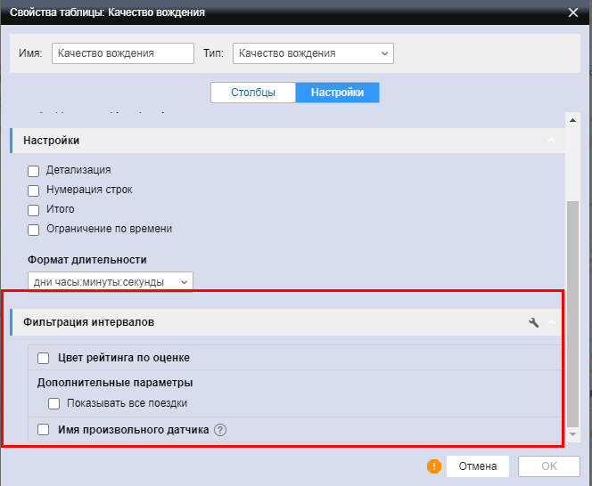 Очень мало настроек фильтрации интервалов для таблицы "качество вождения", тип "шаблона группа водителей". Есть только цвет рейтинга, показать все поездки и Имя произвольного датчика (скрин прилагаю). Если открыть настройки фильтрации интервалов Качества вождения для типа шаблона "Группа объектов", то там намного больше настроек. Есть возможность фильтрации по геозонам, нарушениям и куча всего.