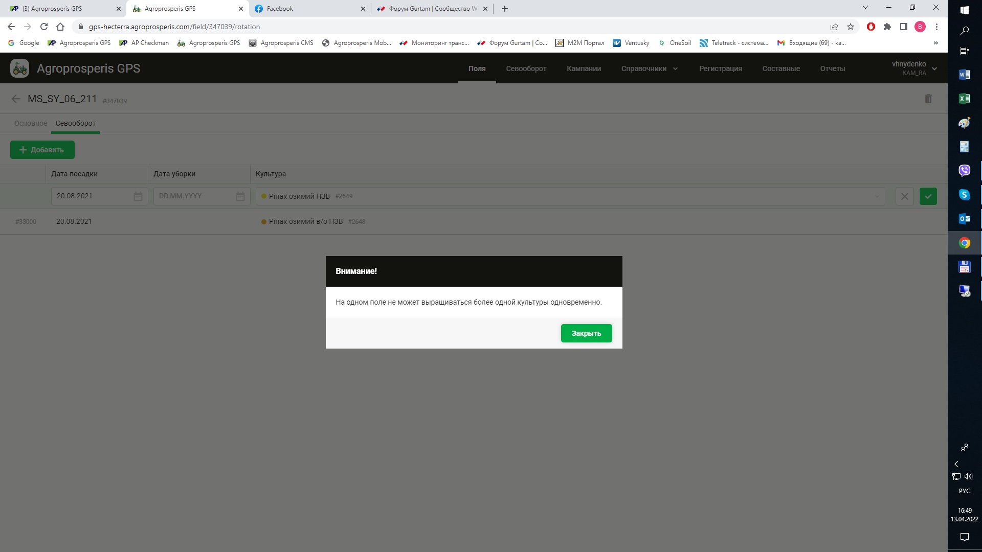 Добрый день. Может пропустил этот вопрос, но при заполнении севооборота не дает