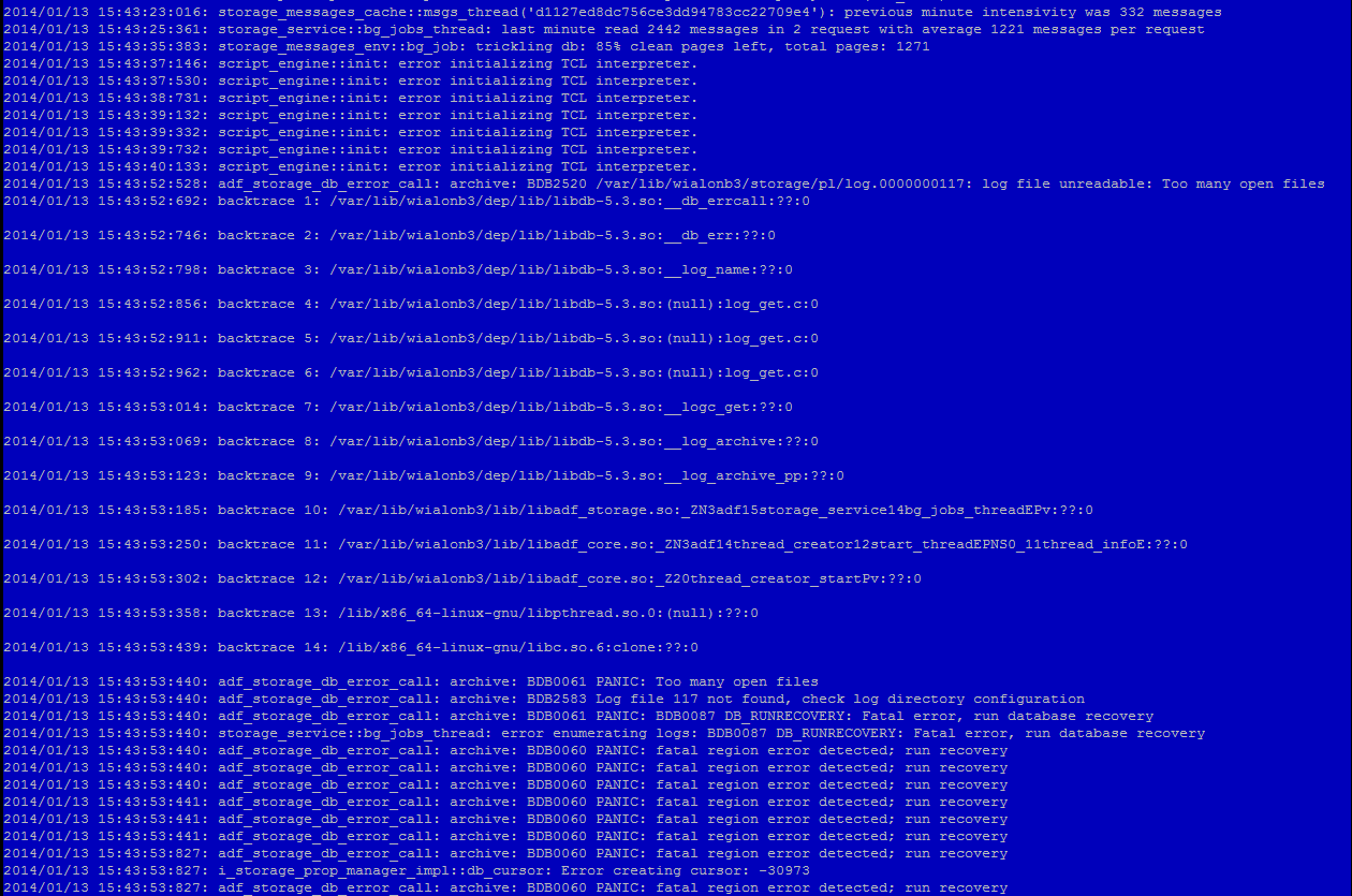 2013/08/15 10:31:42:833: adf_storage_db_error_call: archive: BDB2520 /var/lib/wialonb3/storage/pl/log.0000000009: log file unreadable: Too many open files