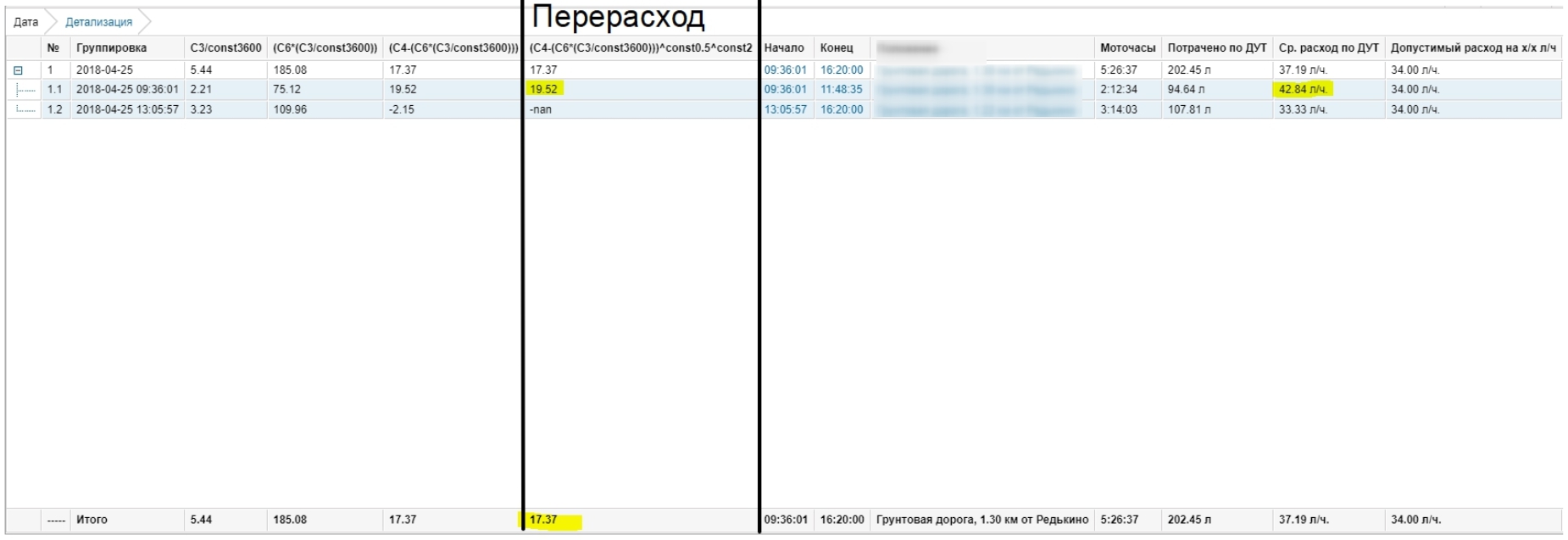 Выбираю интервалы таблицей моточасы со скоростью 0. Там вычитаю из потраченного топлива допустимую норму - считается нормально.