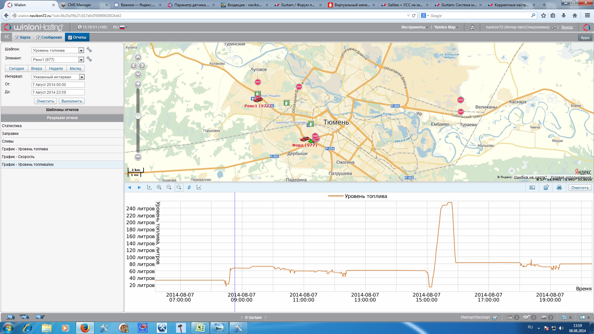 А вот так с настройками: поиск только при остановке нет, мин. объем заправки 10  интервал разд. заправок 300. Всего было за 07.08.2014 2 заправки и 2 слива на графике он видит их при любых настройках но считает непонятно как и откуда он берет эти цифры воопще не понятно.