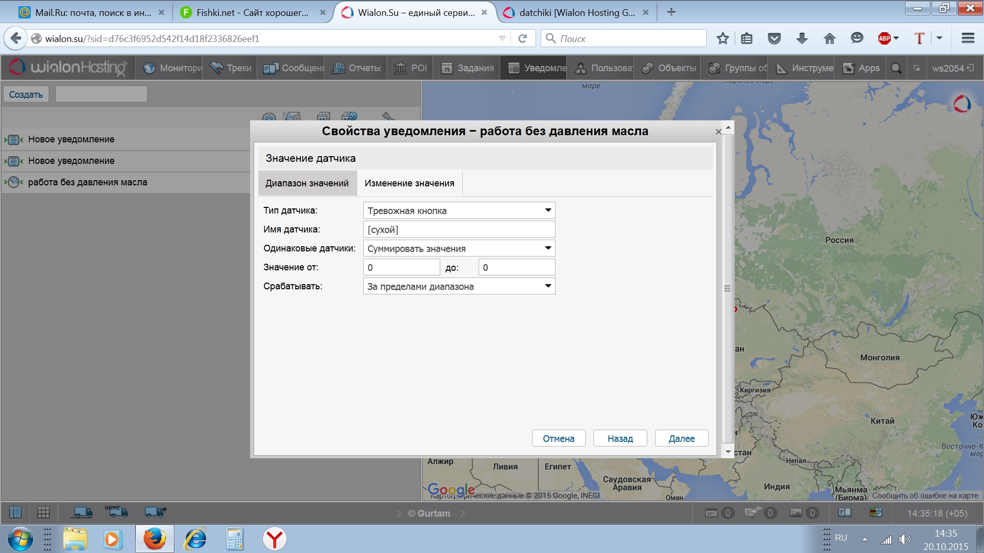 Добрый день всем, возможно вам покажется дурацким вопрос- Как создать Уведомление на основе совпадение нескольких параметров. Пытался сделать так- создал датчик (назвал "сухой") , в нём срабатывает несколько значений по принципу логическое "И", (работающий двигатель, включеное зажигание, горящая лампочка давления масла), датчик работает, это видно на панели обьекта, а созданое на его основе уведомление никак не хочет. Вот чуствую что проблема где то в спецзнаках, пробовал и [сухой], и *сухой*, а всё равно не работает. И в инструкции таких подробностей не нашёл.