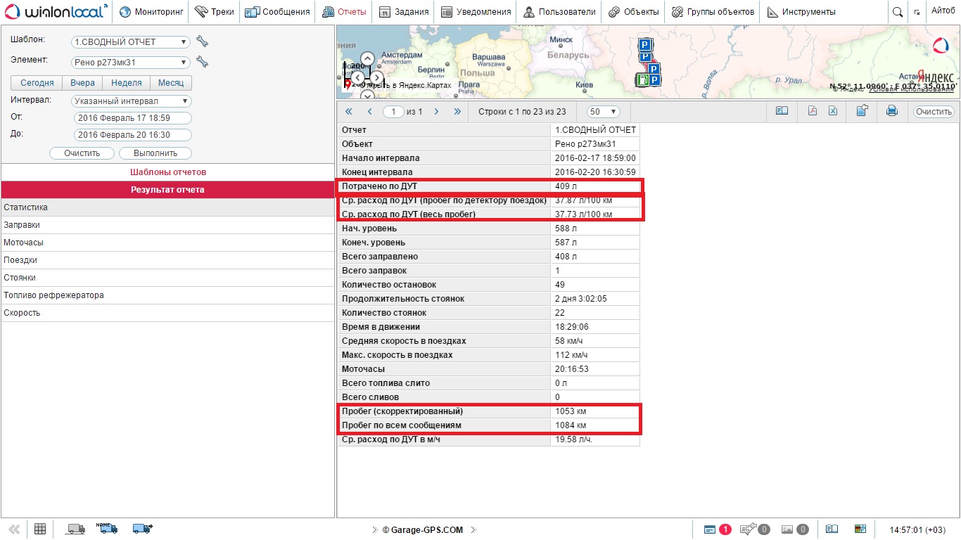 Вообщем в отчете нужен ср.расход 409*100/1053=38.84л