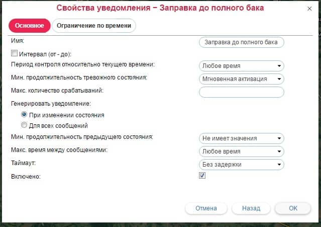 Здравствуйте. Что бы исключить проблемы с переливом топлива свыше значений видмых ДУТ-ом (заправка под горлышко) экспериментирую с уведомлением работающим по "Параметру в сообщении". Выбираю нужный мне параметр "dut_lvl", тип контроля "диапазон значений", выбираю нужный мне интервал значений (близкий к максимальному) , срабатывание внутри диапазона. Провожу нужные мне настройки куда уведомить, остальное жму "далее". В итоге получаю много следующих друг за другом уведомлений от одного и того же объекта. Нужно , что бы сообщение приходило 1 раз от каждого транспортного средства при попадании значений ДУТ в этот интервал после заправки. Вопрос можно ли так сделать? Эксперименты с настройками к нужному результату не привели ![]()