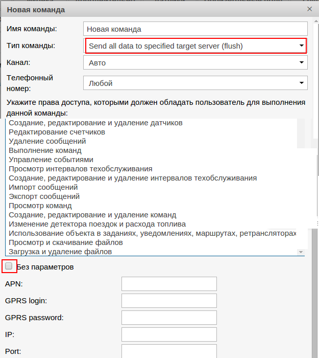 4. Заходим в меню команды. Создем команду для примера setdigout 11 которая активирует цифровые выходы и к примеру машина запускается или открывается багажник. Или команду getgps. Протокол передачи данных выбираем TCP потом убираем галочку в окошке Без параметров и пишем без пробелов перед текстом setdigout 11 или getgps. Готово