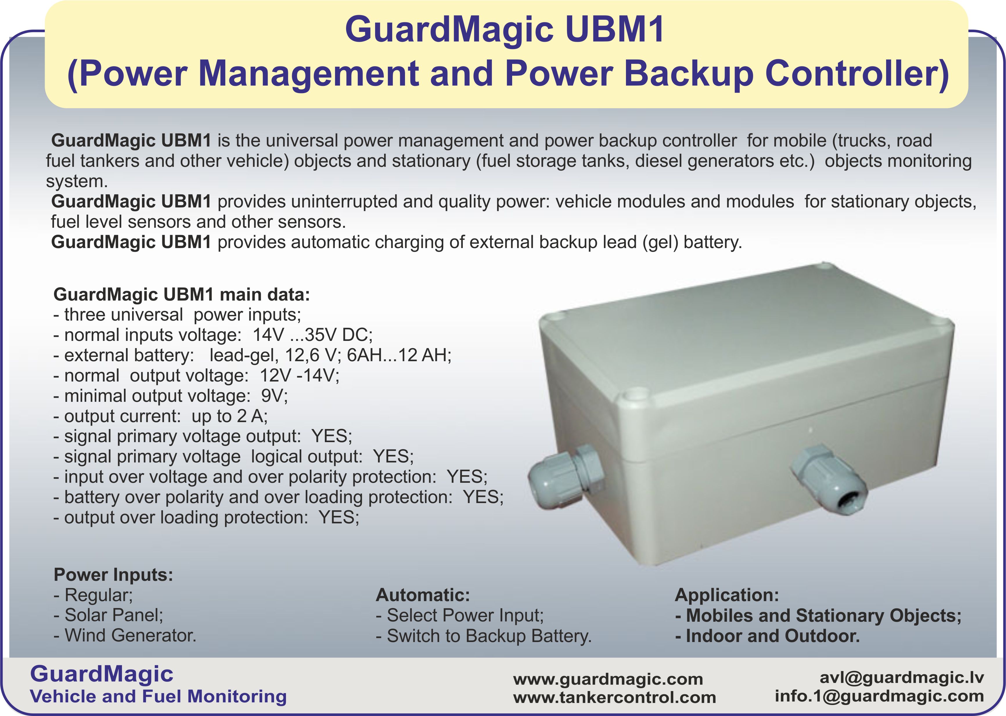 GuardMagic UBM1 allows by very economical way embed power backup functionality to vehicle and fuel monitoring system, road fuel tanker monitoring system, fuel storage tank monitoring system, diesel generator monitoring system etc.