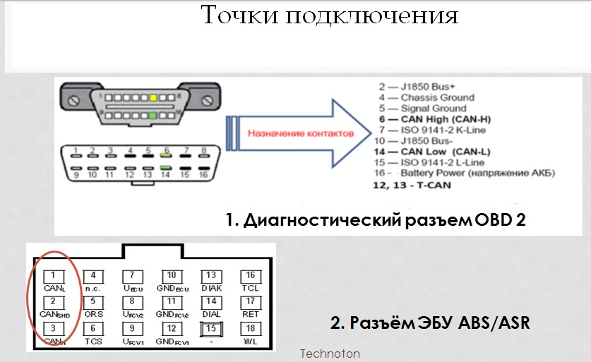 как и на всех а/м есть разъем диагностический OBD2 - трапецевидный. С обратной стороны - витая пара, цоколевка на картинке.
