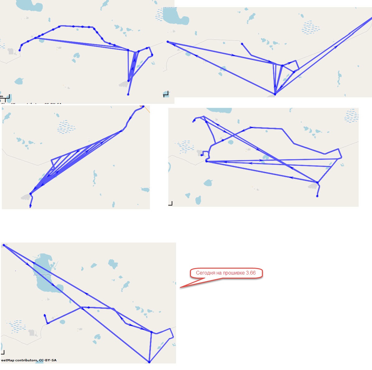 Добрый день! Блок Арнави давал перелеты траектории. Я надеялся его обновлением прошивок поправить, 0.62-1.66-2.66-3.66 поочередно попрошивал, бесполезно. На днях появилась 3.66, залил ее в блок, смотрю - вроде пошло нормально, и снова полеты. Скрин ниже вкину, показаны траектории за дни августа, и за сегодня. Вопрос: почему блок дает такие перелеты? Что делать? Менять блок? По другим блокам вроде нормальные траектории.