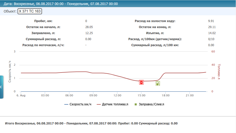 29.05 произошло вообще странное, машина утром выехала с базы, остановилась возле заправки, заправилась под горловину и поехала на "дальняк". На графике топлива машина проехала 480км (до предполагаемой очередной заправки) а на графике уровень топлива не менялся, колеблясь на уровне 62л (т.е. не КЗ со значением 4095 как было бы в случае воды на дне). После этой заправки (видать нормальное топливо было) пошел расход на графике. Далее машина приехала на точку, постояла час, затем после того как она проехала 30км показывая расход с уменьшением вдруг опять зафиксировался уровень на 42 литрах и она до конца дня и следующий день ехала на этих 42л. По возвращении из рейса она нормально заправилась, показав точную заправку в 30л, после чего уже таких зависаний уровней не было, но начались частые ночные скачки. Т.е. машина остановилась на базе, топливо пошло на 3л вверх, резкая коррекция до первоначального, затем опять вверх, опять резкая коррекция, и так до 3-х раз за ночь.