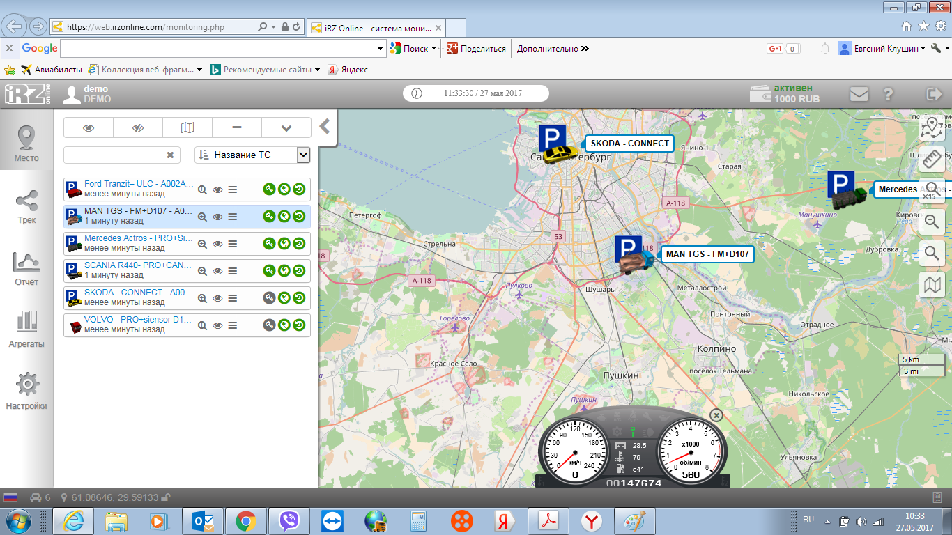 Зашел на досуге посмотреть хостинг iRZ Online, сильно пока в программе не разобрался, ну интерфейс вроде ничего. Сразу понравилось одно решение, предлагаю разработчикам его тоже реализовать на Wialon. Вот такая панель, как показано на скрине, которая имитирует панель приборов автомобиля и в режиме он-лайн, показывает обороты, скорость, уровень топлива. Конечно в Wialon это всё можно посмотреть, но мне кажется такая панель очень понравиться конечному пользователю, а то из вечный вопрос задают клиенты - как посмотреть сколько сейчас топлива в баке, ну и начинаешь им объяснять, а они как всегда тупят, а такое решение  решила бы данную проблем