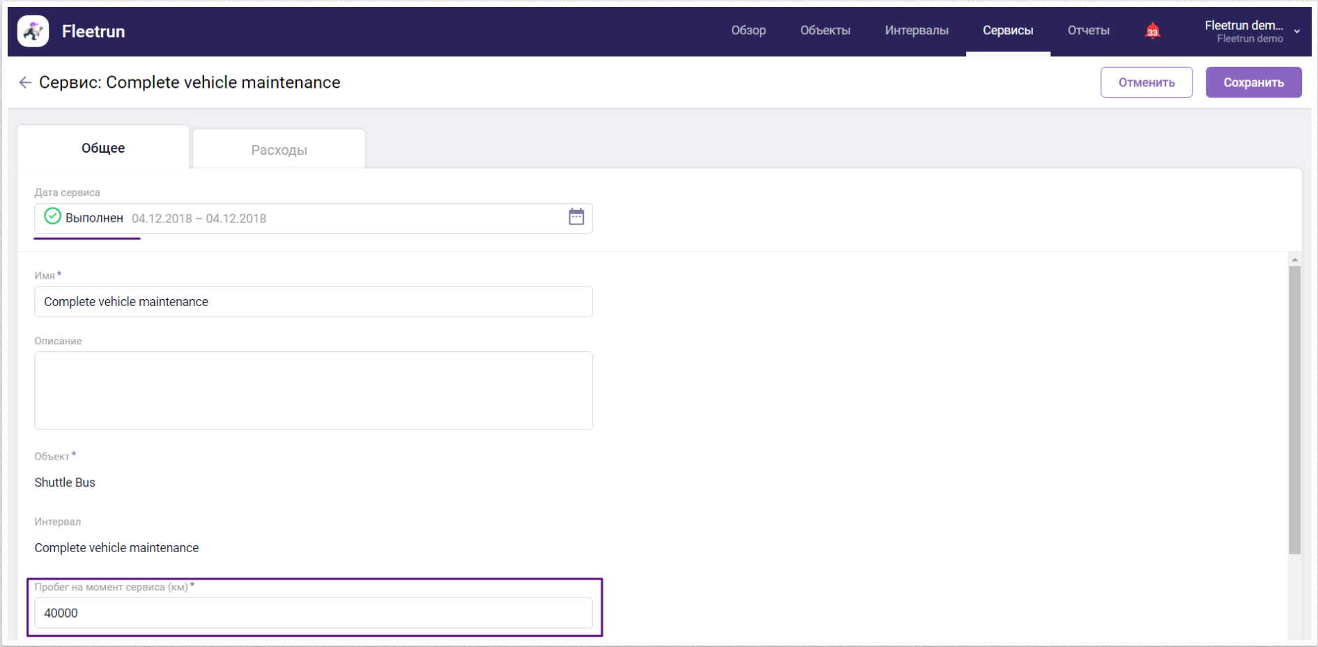 На скриншоте сервис регистрируется для объекта Blue Bus, по умолчанию для него выставлен текущий пробег, который равен текущему пробегу на страннице данного объекта.