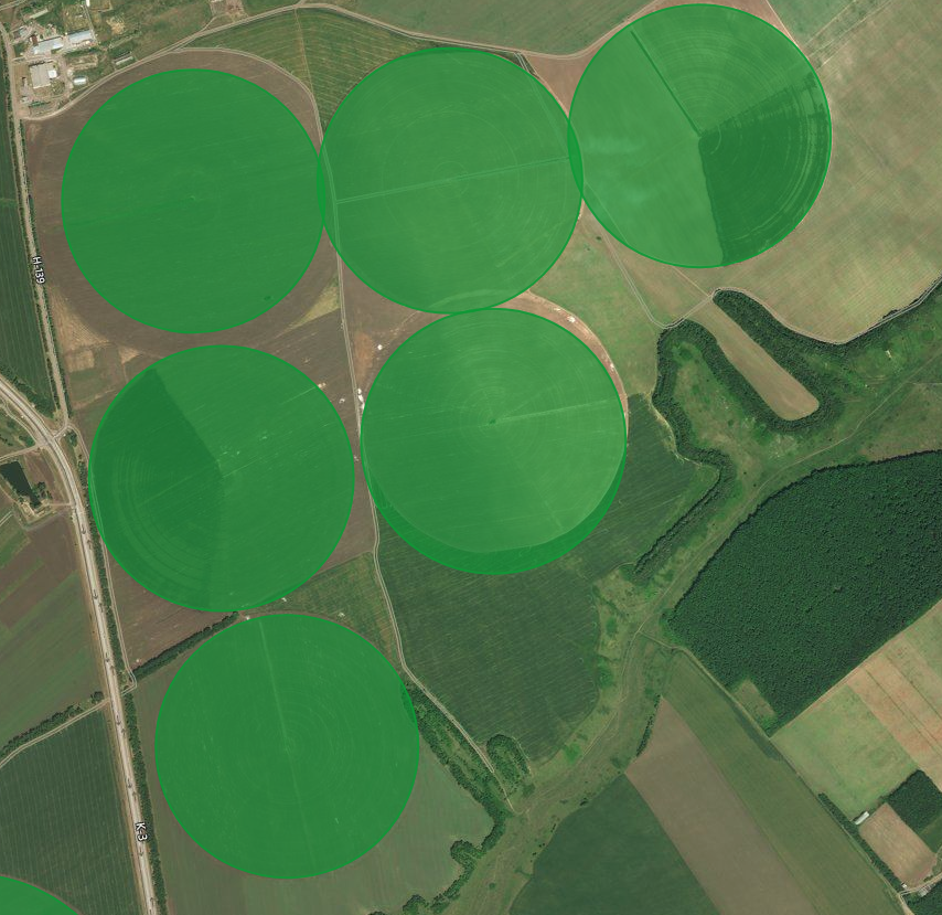 Если клиенту нужно определять находится ли объект внутри поливного круга, то можно использовать стандартную виалоновскую геозону типа круг. Это не будет полем или участков в Хектерре.