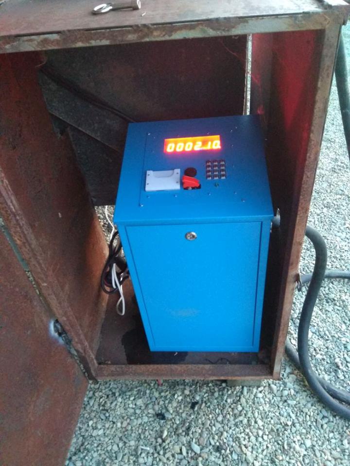 Внешние характеристики: Колонка снабжена ручками для переноса, с левой стороны вход под шланг 25мм. На входе желательно использовать очень жесткий шланг, для того чтобы, при прокачке топлива он не слипался, так как насос вызывает вакуум в шланге. С правой стороны выход для выдачи топлива, так же на 25мм. С левой стороны расположена коробка с контактором для пуска двигателя с встроенным предохранителем и тумблером для выключения питания. Сверху находится клавиатура для набора дозы и для программирования. Так же есть кнопка экстренного стопа с индикацией доступа и резервный тумблер для отгрузки без пластиковых карт, который пломбируется. Все операции настройки и управления выполняются через клавиатуру.