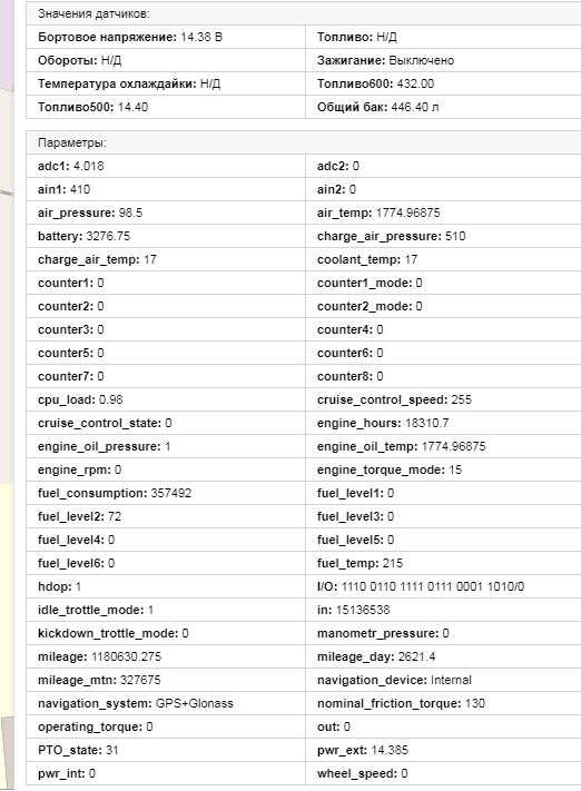 Llirik81 так и есть зажигание на in3. В продолжении темы разбора данных с Автографа... Как вычислить уровень топлива с этой же тачки. Видно, что параметр fuel_level2: = 100, но он не меняется?! И в какой размерности приходят данные по топливу?