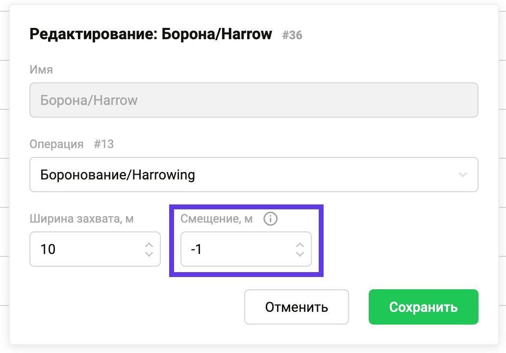Смещение можно задать как в самом агрегате, так и непосредственно при регистрации обрабокти. Положительно число — смещение вправо,  отрицательное — влево. Задается в метрах, возможна дробная чатсь.