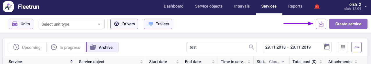 Today we are introducing a major update to Fleetrun. The functionality of reports has become more advanced. Now users are able to run reports for any services status (previously it was possible only for closed and rejected services). Besides, the system currently allows to get data for more than 1 element (interval, unit type and unit).