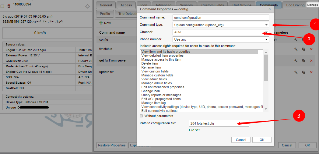 2) Update firmware from FOTA server(TCP) - update firmware. In the command settings the following parameters should be entered: firmware name (the list can be obtained by Get firmware list from FOTA server command), APN,APN username,APN password. The device should reply when gets the firmware. You can see the progress of update by "Firmware status" command.