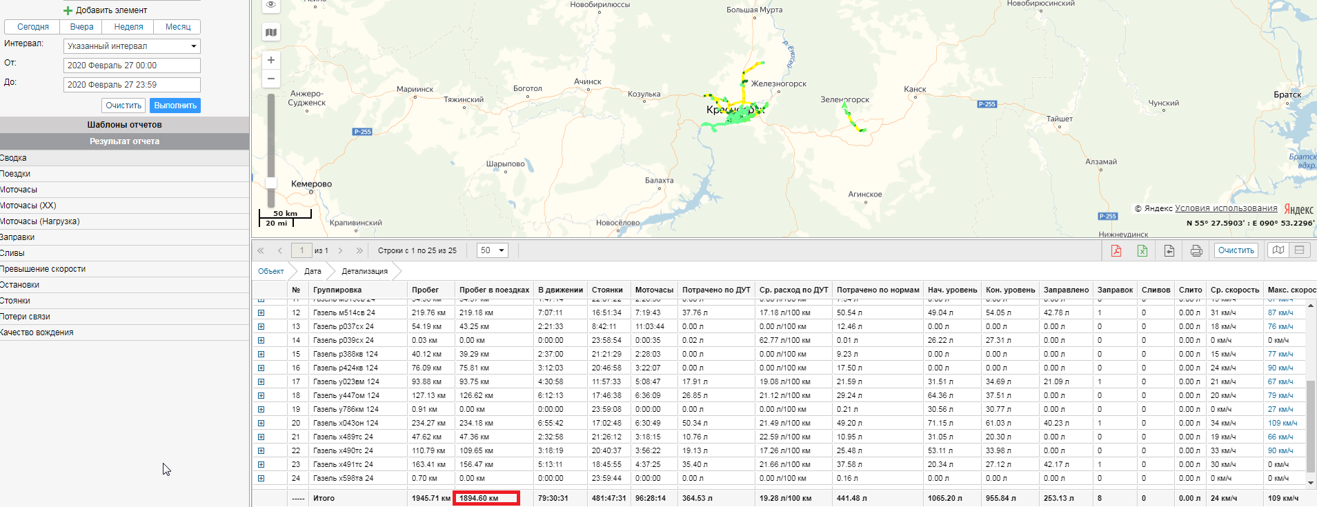 Как у вас детектор поездок настроен и как учитывается пробег в настройках отчета?