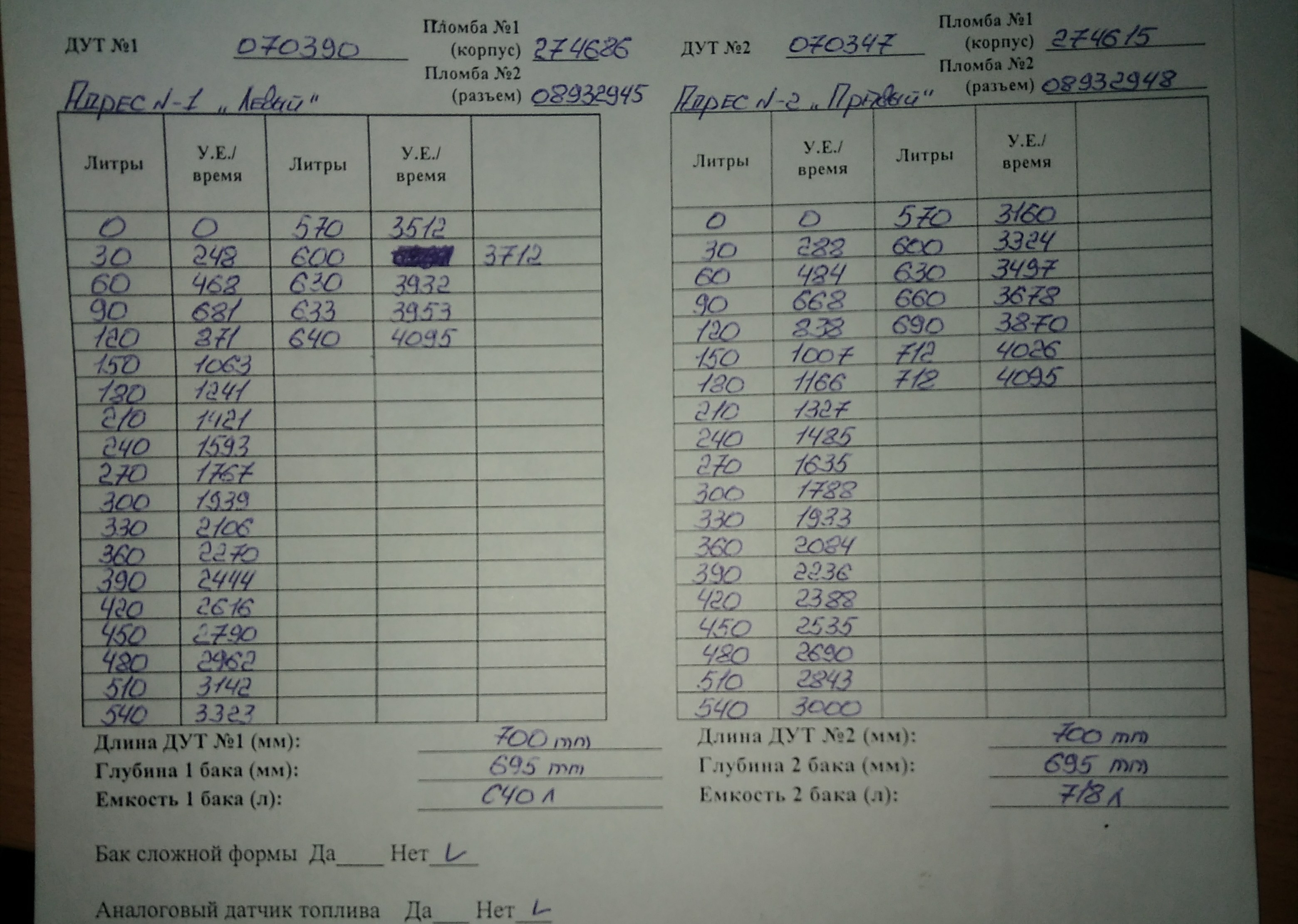 Установлено по 1 ДУТ Эскорт ТД 150 в каждый бак. Настроены до 4095ед.