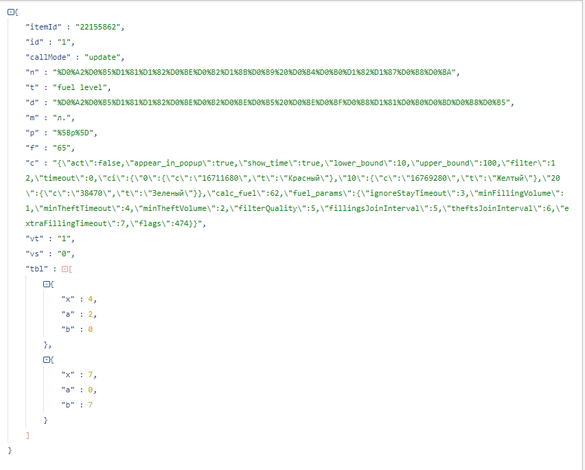 "params":{"n":"Дут","t":"fuel level","d":"","m":"л","p":"fuel","f":0,"c":"{\"act\":1,\"timeout\":0,\"mu\":\"0\",\"appear_in_popup\":true,\"calc_fuel\":2,\"ci\":{},\"cm\":1,\"fuel_params\":{\"fillingsJoinInterval\":300,\"flags\":1408,\"ignoreStayTimeout\":20,\"minFillingVolume\":50,\"minTheftTimeout\":10,\"minTheftVolume\":60,\"theftsJoinInterval\":400,\"filterQuality\":0},\"pos\":11,\"show_time\":false,\"uct\":0}","vt":0,"vs":0,"tbl":[],"id":11,"itemId":22088658,"callMode":"update"}}],"flags":0}
