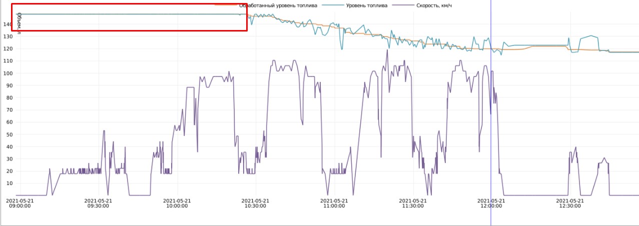 - из-за конструктива бака и длинной горловины имеет место след картина - ТС работает а расхода гсм нет (график во вложении)