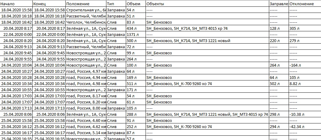 В данном случае вам, предположительно, потребуются следующие столбцы: Начало, Конец, Длительность, Положение, Тип, Объем, Геозоны/Объекты (в вашем случае можно будет переименовать этот столбец просто в "Объекты"), Заправлено и Отклонение.