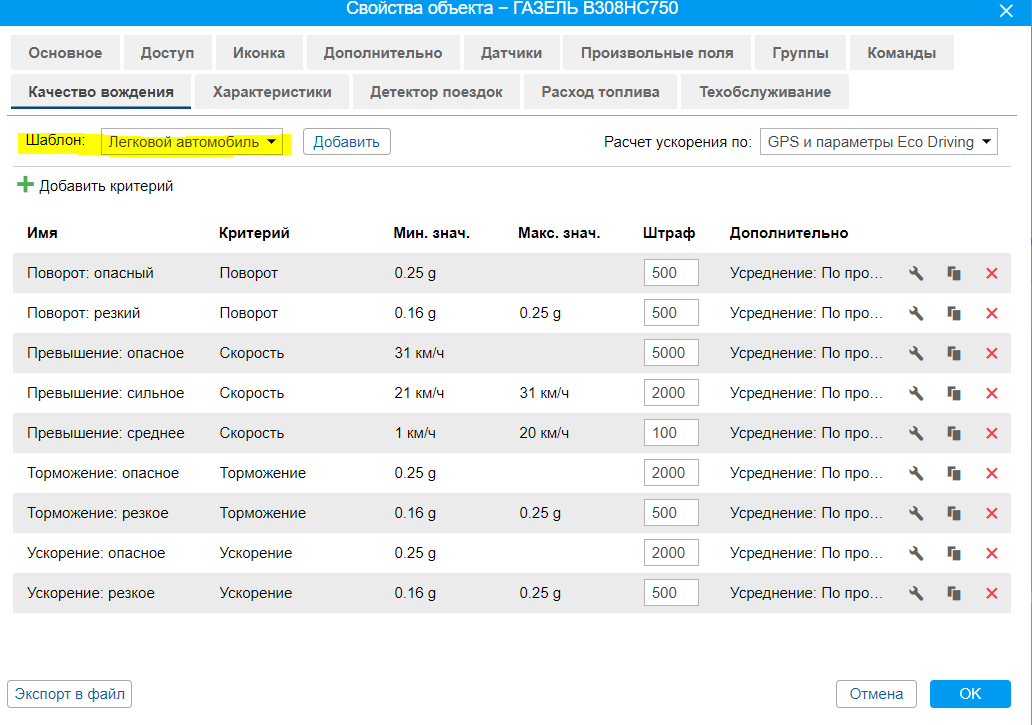 Здравствуйте! Хочу предложить добавить статус шаблона в свойствах объекта по качеству вождения. Сейчас не понятно какой из шаблонов выбран: для грузового, легкового или вообще для автобуса.