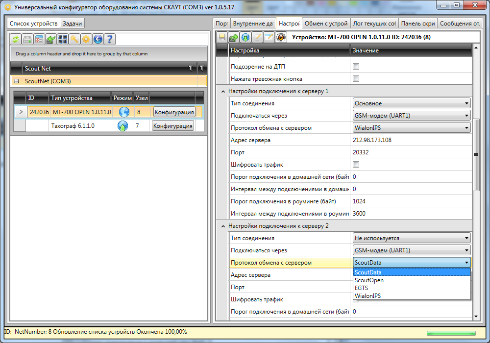 Рис 1.Настройка оборудования (можно параллельно использовать 2 сервера). Слева в списке устройств "видим" тахограф: