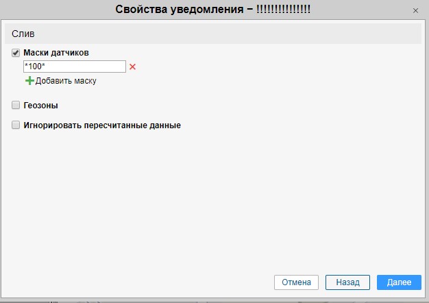 Имеется оборудование Сигнал 2551 и ДУТ. При отсутствии питания на ДУТ на Wialon PRO приходит параметр со значением 65530(нет связи с дут). Задача- создать уведомление при появлении значения 65530. Но дело в том, что необходимо исключить стандартное отключение питания автомобиля. Чтоб при наличии питания (массы) автомобиля проверялся параметр топлива, и если он был равен 65530(тоесть нулю) то выскакивало уведомление. И соответственно , если оба параметра равны нулю(или борт сеть ниже обычного -24В а топливо-65530), то не выскакивало уведомление.
